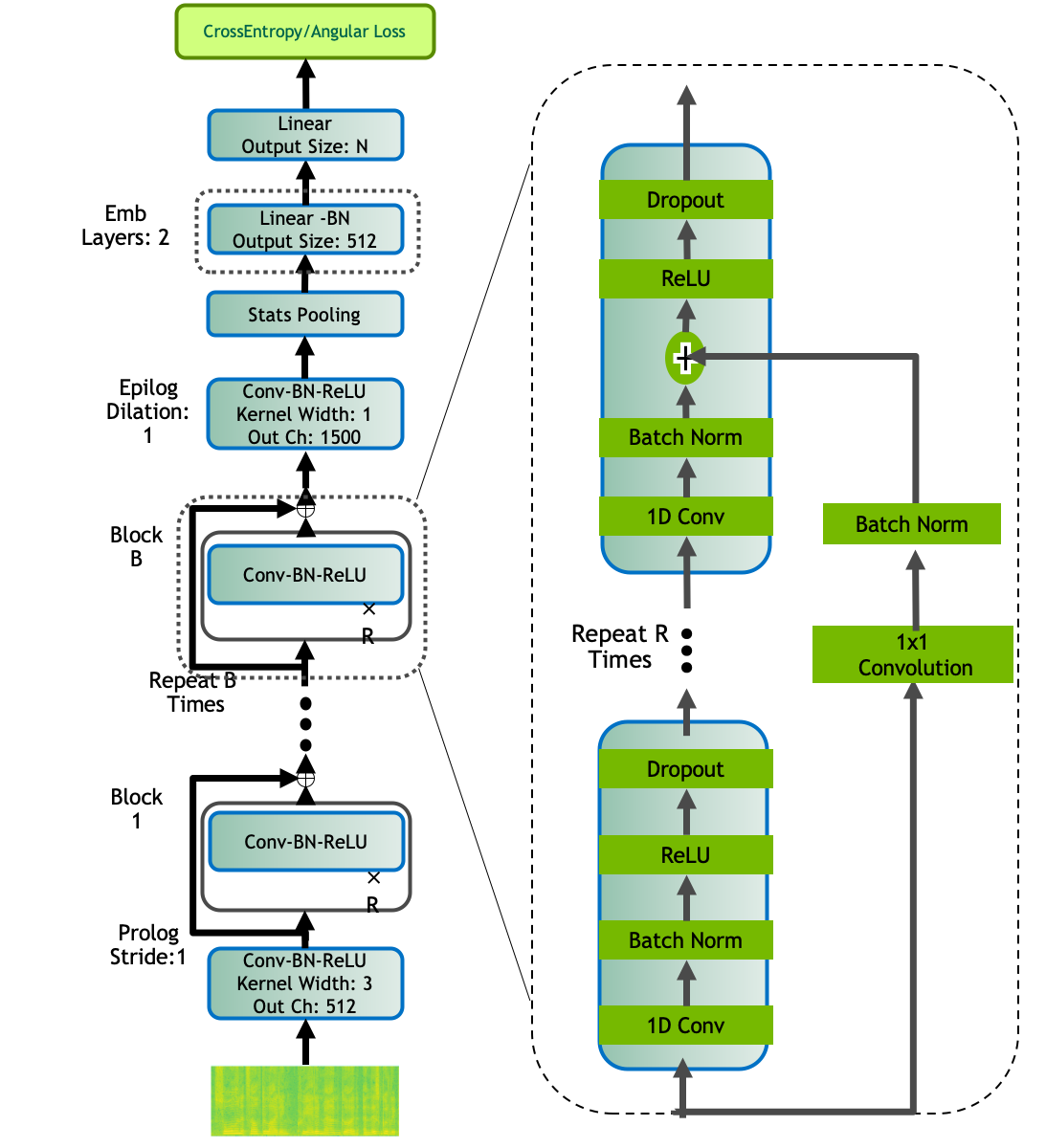 The QuartzNet encoder used for speaker embeddings shown in figure below has the following structure: a QuartzNet BxR model has B blocks, each with R sub-blocks. Each sub-block applies the following operations: a 1D convolution, batch norm, ReLU, and dropout. All sub-blocks in a block have the same number of output channels. These blocks are connected with residual connections. We use QuartzNet with 3 blocks, 2 sub-blocks, and 512 channels, as the Encoder for Speaker Embeddings. All conv layers have stride 1 and dilation 1.