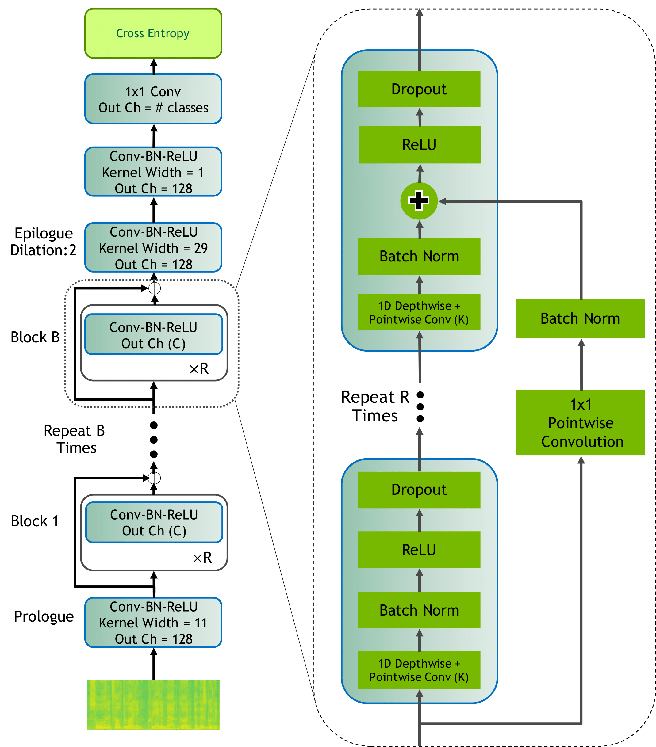 MatchboxNet [SC-MODELS2] is an end-to-end neural network for speech command recognition based on QuartzNet.