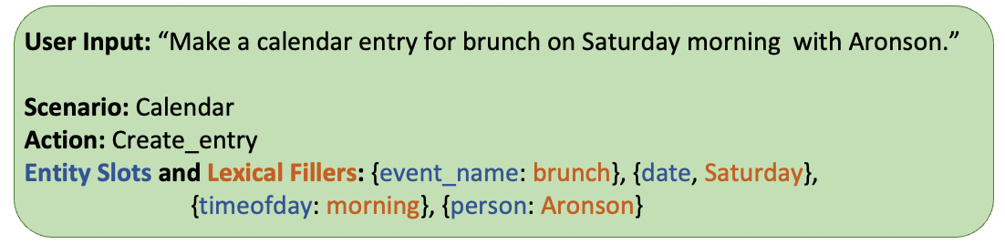 Intent Classification and Slot Filling aims to not only recognize the user’s intention, but also detect entity slots and their corresponding lexical fillers. Below is an example: